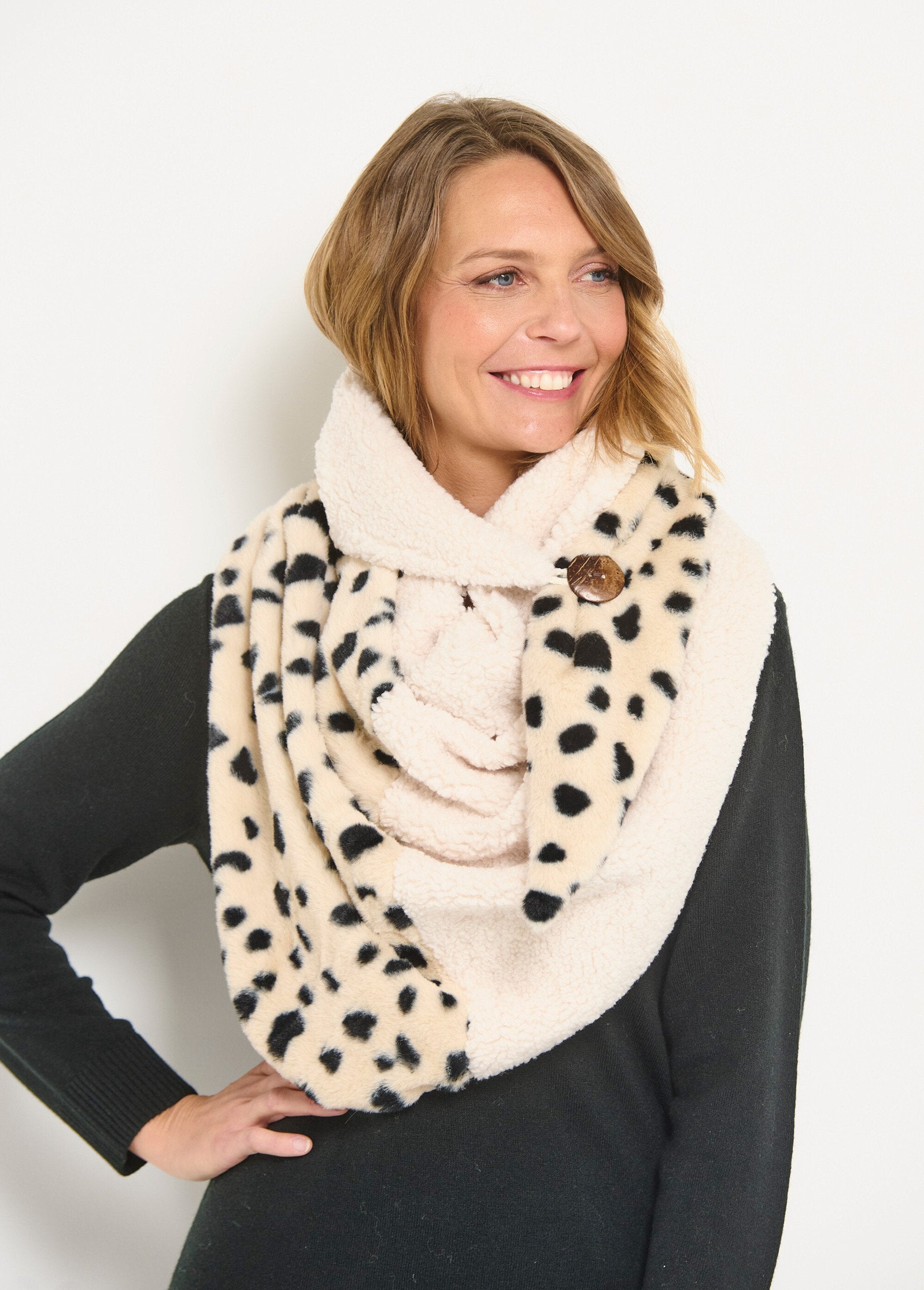 Questo elegante e caldo scaldaspalle combina il morbido pile con l'imitazione della pelliccia di dalmata per un fattore wow! Il rovescio è realizzato con una maglia in pile coordinata per un tocco di morbidezza in più. Si chiude con un grazioso bottone di legno. Perfetto per riscaldare i vostri abiti con stile, questo scaldaspalle è ideale per le fredde serate autunnali o come accessorio chic per le occasioni speciali.