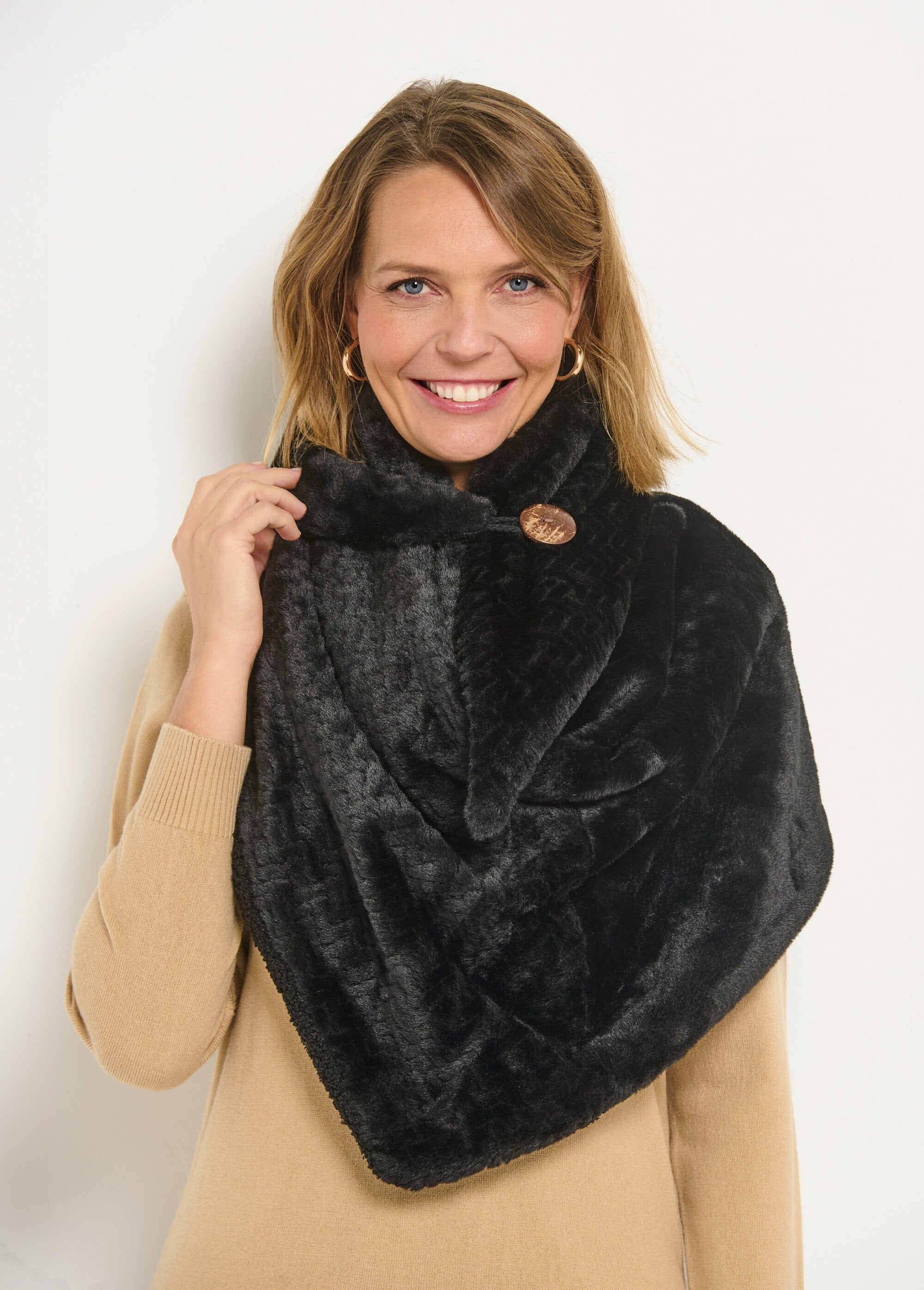 Questo elegante e caldo scaldaspalle combina una morbida texture di pelliccia sintetica liscia con un motivo a spina di pesce tonale, mentre il retro è realizzato in bouclette coordinata. Per un effetto più evidente, presenta un motivo a imitazione della pelliccia dalmata che aggiunge un tocco audace e raffinato. Il retro in maglia di pile offre un comfort extra e la chiusura è assicurata da un bottone di legno scelto con delicatezza. Perfetto per riscaldare i vostri outfit con stile, questo accessorio si presta tanto alle fredde serate autunnali quanto alle occasioni speciali in cui eleganza e comfort sono all'ordine del giorno.