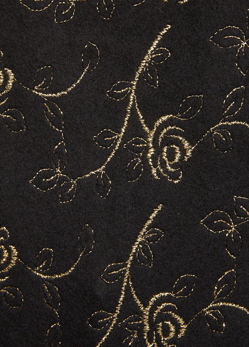 Un maglione seducente. Il suo aspetto morbido (la maglia è smerlata per aggiungere volume e calore) è completato dalla bellezza dell'applicazione in filo dorato sul davanti. Le spalle leggermente scese e le maniche lunghe con arricciature assicurano una silhouette perfetta. Rifinito con una costina attaccata.