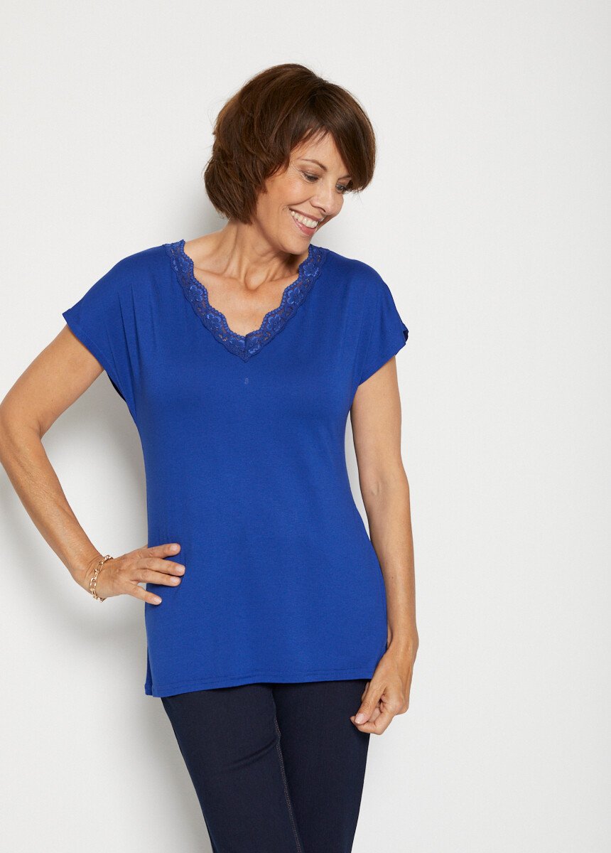 Con la sua scollatura sublime e la sua maglia morbida, la T-shirt dà il tono... Fascino e seduzione prima di tutto! Pizzo tono su tono sulla scollatura anteriore a V. Sbieco sulla scollatura posteriore. Maniche corte a kimono. Fondo dritto. Realizzato in Francia.