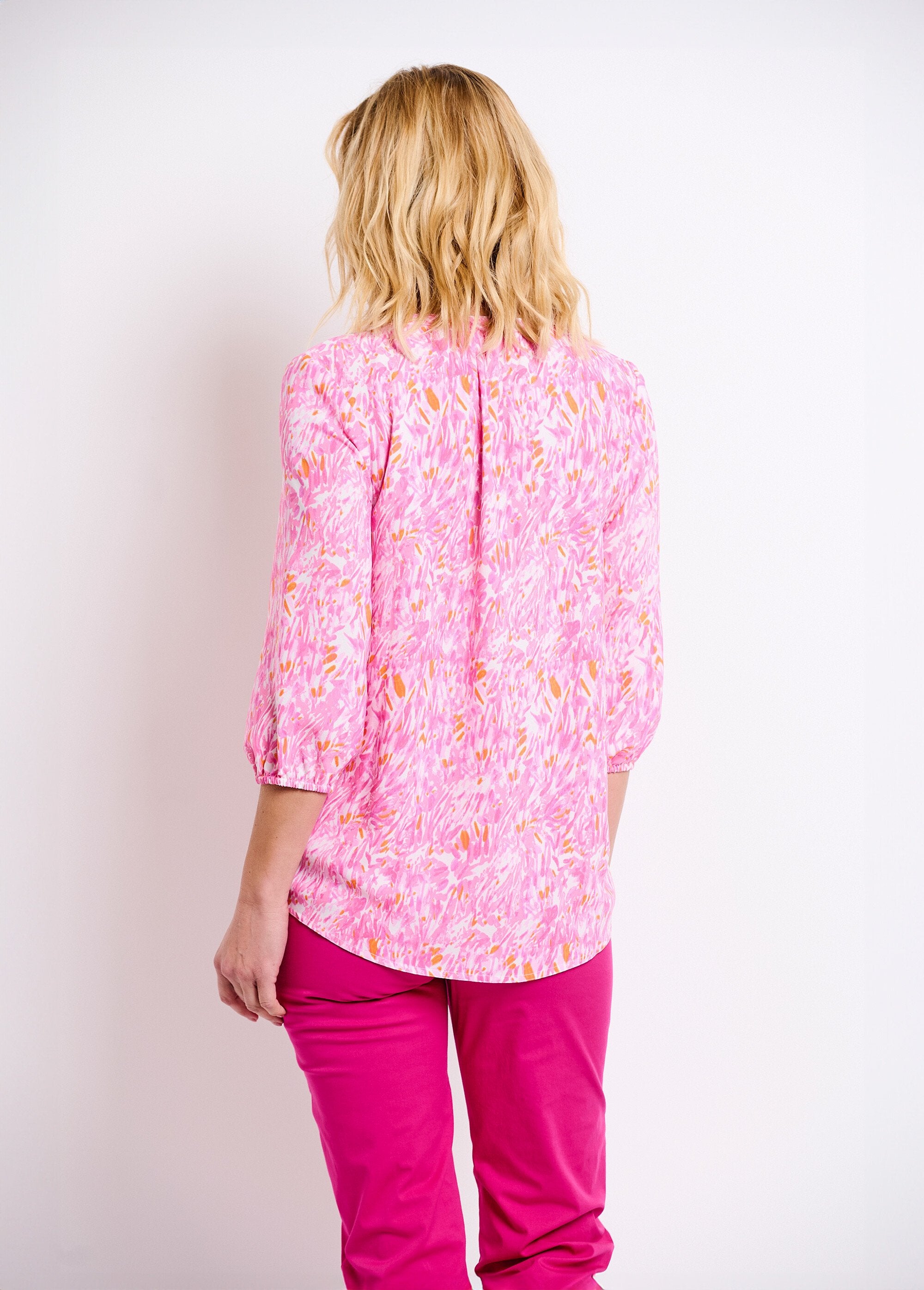 Ampia, morbida e facile da indossare, la tunica è caratterizzata da un tessuto morbido al tatto, da una stampa di tendenza e da un volume abbondante. La scollatura rotonda a V aperta sul davanti è sottolineata da un'abbottonatura a 3 bottoni. Le arricciature sotto la scollatura anteriore e posteriore aggiungono facilità e volume. Maniche a 3/4, polsini elasticizzati. Orlo leggermente arrotondato.
