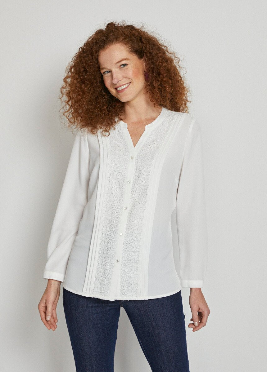 Tunica chic e in pizzo! Scollo rotondo a V aperto. Plissettature e inserti in pizzo lungo ogni lato dell'abbottonatura. Maniche lunghe con bracciali abbottonati, pieghe di facilitazione e spacco antistrappo. Bottoni perlati femminili. Base leggermente arrotondata con spacchi laterali.