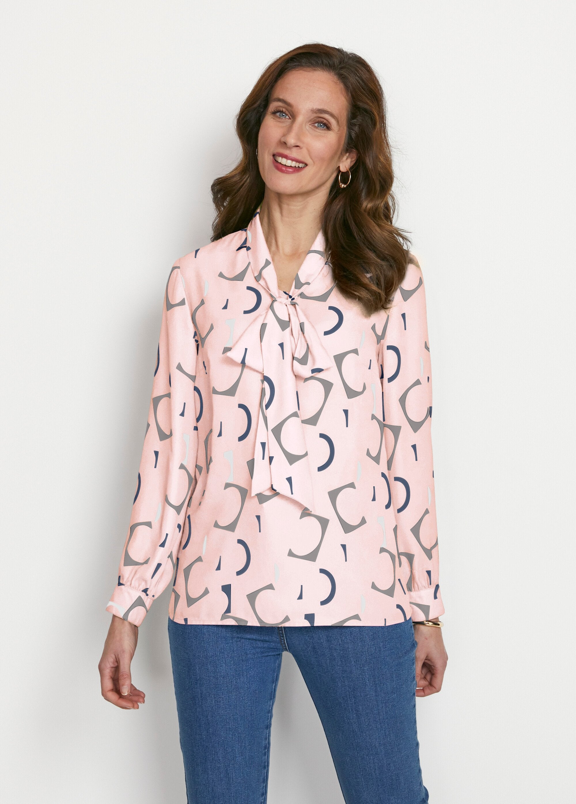 Fluida e leggera, la tunica presenta una sottile stampa grafica. Dettaglio sbieco sulla scollatura arrotondata, sottolineato da uno scollo a V con lacci stile lavallière. Maniche lunghe arricciate, polsini con bottoni. Orlo arrotondato. Finitura impunturata.