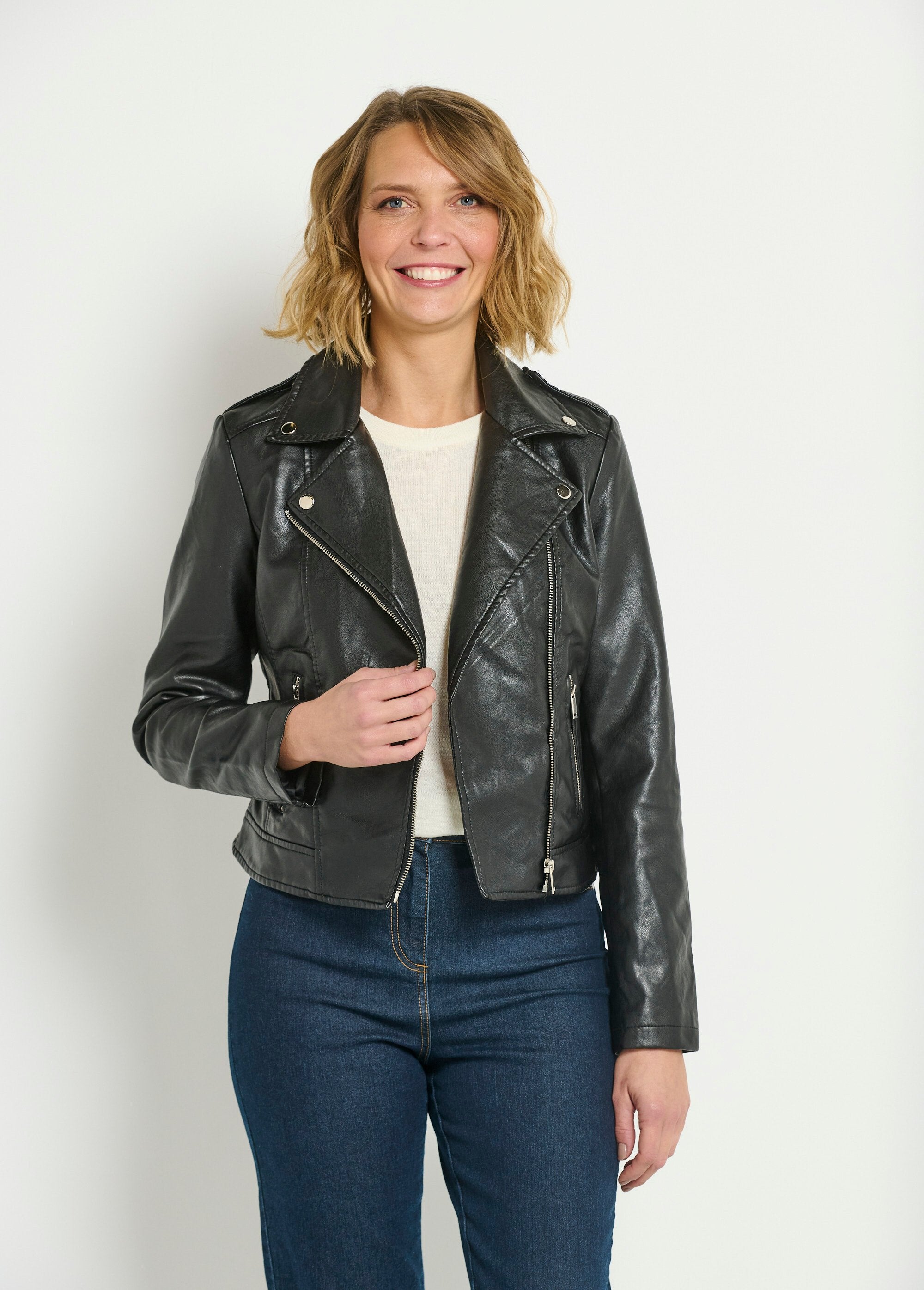 Questa giacca ha molto stile e, stagione dopo stagione, è un must-have in ogni guardaroba! Prendendo in prestito i codici classici della giacca da motociclista, presenta un colletto con bottoni a pressione, linguette sulle spalle e tagli a principessa sul davanti e sul retro che scolpiscono la silhouette. Le tasche con zip aggiungono un tocco pratico e rock. Questa giacca con zip è l'alleato perfetto per chi vuole aggiungere una dose di audacia e carattere al proprio guardaroba, con un look decisamente moderno.